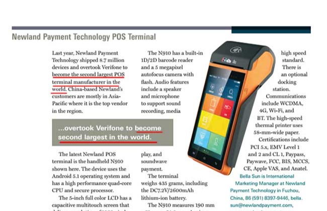 According to the Nilson Report, Newland became the world’s No. 1 POS terminal supplier by shipment volume
